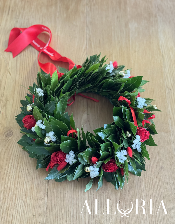 Corona di Laurea realizzata con Alloro Fresco e Naturale preso direttamente dalla nostra piantagione in Valle Brembana. La Corona viene decorata con Nastri di Raso o di Tulle a vostra scelta, 5 Roselline artificiali rosse Gipsofila artificiale Bianca (velo da sposa), Bacche oro artificiali e Lagurus mini pampas rossi.