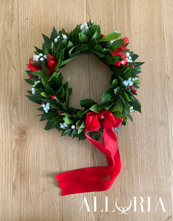 Corona di Laurea realizzata con Alloro fresco e naturale preso direttamente dalla nostra piantagione sita in Valle Brembana. La Corona viene arricchita con piccole Bacche Rosse Artificiali, Gipsofila Artificiale bianca e Nastri di raso o tulle a vostra scelta.