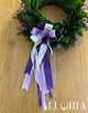 In Foto 1: Corona di Alloro con Erica artificiale rosa, Mini pampas Lagurus lilla, Mini Spighe Phalaris viola, Lavanda Stabilizzata, Fiocco a Coccarda con perlina Lilla, Viola, Bianca a code a rondine lungo fino alle spalle. Il velo stabilizzato può tendere al marrone chiaro. Per avere tali nastri è necessario personalizzare la corona in fase d'acquisto, se non verranno fornite queste informazioni la corona verrà decorata con fiocco semplice a 2 code lungo fino alle spalle.