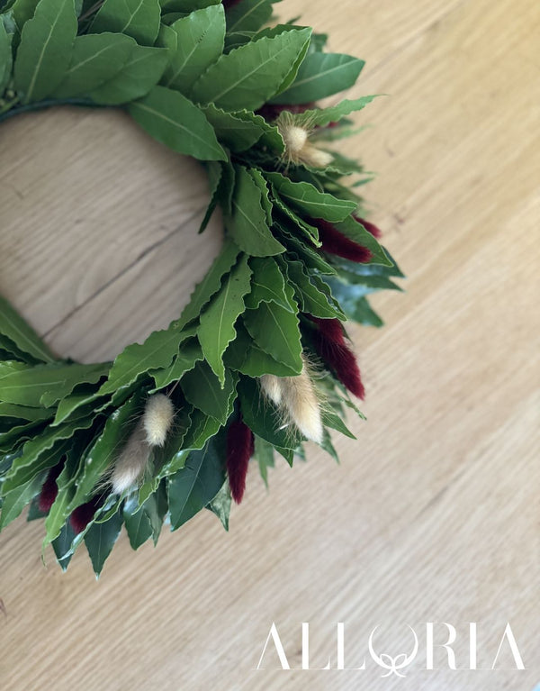 Corona di Laurea realizzata con Alloro Fresco e Naturale preso direttamente dalla nostra piantagione in Valle Brembana, Lagurus mini pampas bordeaux e avorio. La Corona può essere decorata con Nastri di Raso o di Tulle a vostra scelta.