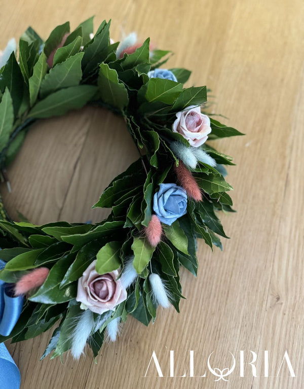 Corona di Alloro per Laurea con Roselline azzurre, rosa e Lagurus azzurri e rosa antico