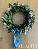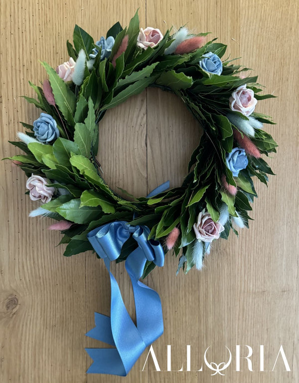 In Foto 1: Corona di Alloro con 4 Roselline Artificiali azzurre e 4 rosa, Mini Pampas Lagurus azzurri e rosa antico, Fiocco elaborato color carta da zucchero a 2 code a rondine lungo fino alle spalle. Per avere tali nastri è necessario personalizzare la corona in fase d'acquisto, se non vorranno fornite queste informazioni la corona verrà decorata con fiocco semplice a 2 code lungo fino alle spalle.