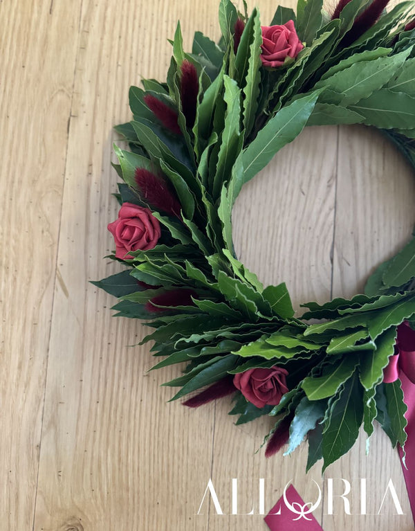 Corona di Laurea realizzata con Alloro Fresco e Naturale preso direttamente dalla nostra piantagione in Valle Brembana, Lagurus mini pampas bordeaux e 5 roselline rosse artificiali. La Corona può essere decorata con Nastri di Raso o di Tulle a vostra scelta.