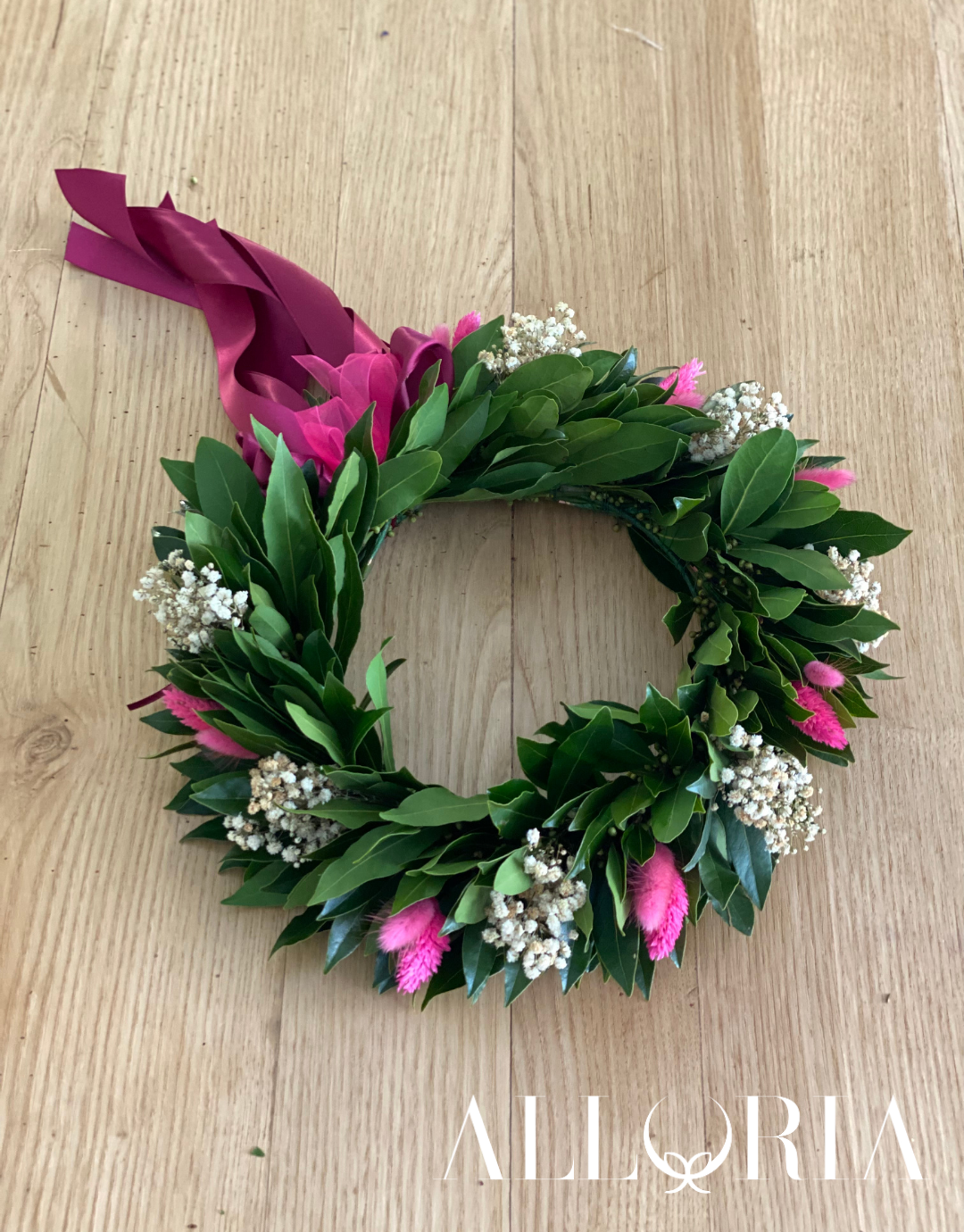 Corona di Laurea realizzata con Alloro fresco e naturale preso direttamente dalla nostra piantagione sita in Valle Brembana. La Corona viene decorata con Gipsofila Stabilizzata Avorio, Mini Pampas Lagurus e Mini Spighe Phalaris Fucsia e Nastri di raso o tulle a vostra scelta.
