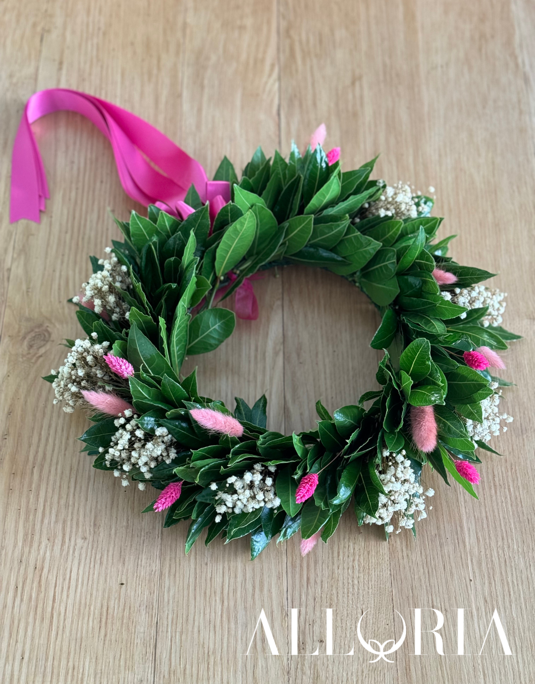 Corona di Laurea realizzata con Alloro fresco e naturale preso direttamente dalla nostra piantagione sita in Valle Brembana. La Corona viene decorata con Gipsofila Stabilizzata Avorio, Mini pampas Lagurus Rosa antico, Mini spighe Phalaris fucsia, Nastri di raso o tulle a vostra scelta.