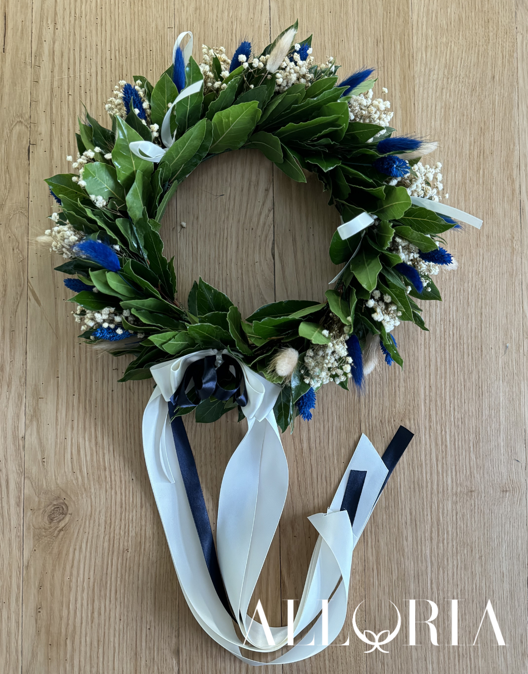 Corona di Laurea realizzata con Alloro fresco e naturale preso direttamente dalla nostra piantagione sita in Valle Brembana. La Corona viene decorata con Gipsofila Stabilizzata Avorio (velo da sposa), Mini Pampas Lagurus avorio, blu, Mini Spighe Phalaris Blu e Nastri di raso o tulle a vostra scelta.