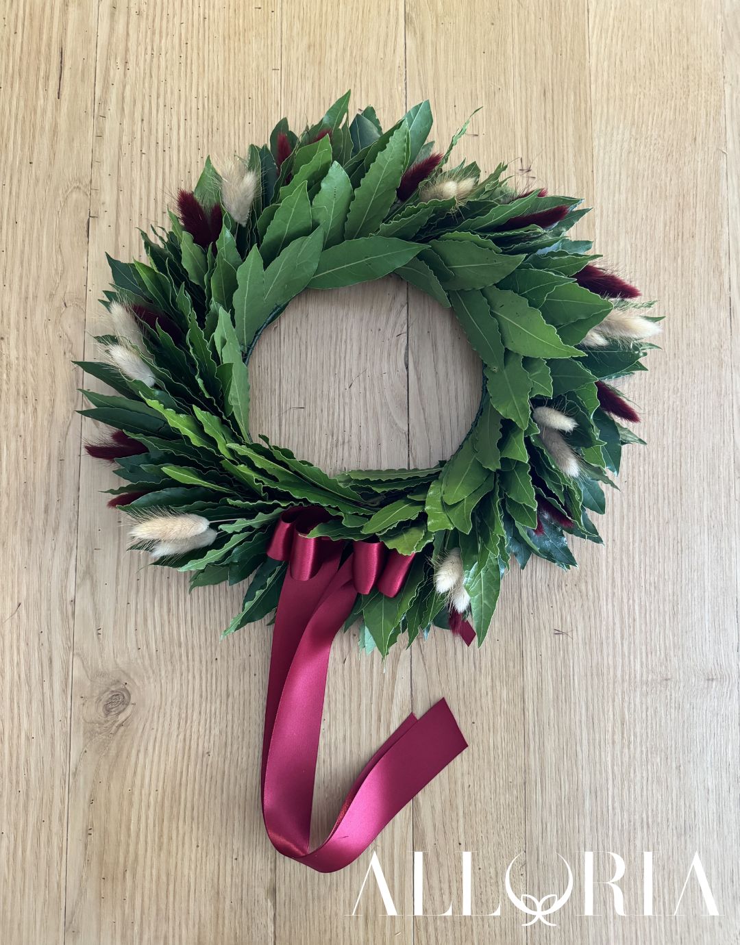 Corona di Laurea realizzata con Alloro Fresco e Naturale preso direttamente dalla nostra piantagione in Valle Brembana, Lagurus mini pampas bordeaux e avorio. La Corona può essere decorata con Nastri di Raso o di Tulle a vostra scelta.